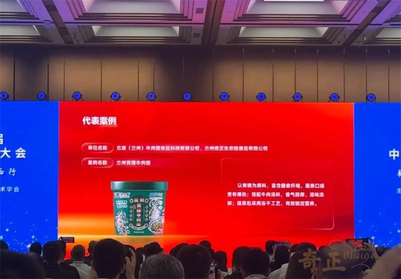在大會(huì)代表案例展示中,由奇正生態(tài)健康品有限公司生產(chǎn)的蘭州青稞牛肉面榮登“2024—2025年度中國方便食品行業(yè)科技與產(chǎn)業(yè)創(chuàng)新新趨勢(shì)代表案例”,該產(chǎn)品以青稞為原料,富含膳食纖維,面條口感更有嚼勁;搭配牛肉湯料,香氣醇厚、滋味濃郁;蔬菜包采用凍干工藝,有效鎖定營養(yǎng)。和傳統(tǒng)牛肉面相比,青稞牛肉面中青稞含量高達(dá)80%,膳食纖維和β- 葡聚糖含量更高,且青稞面餅非油炸,相對(duì)更健康。