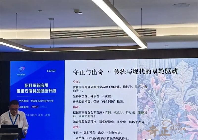 近日,由中國食品科學(xué)技術(shù)學(xué)會(huì)(CIFST)主辦的第二十五屆中國方便食品大會(huì)在四川成都召開。本屆大會(huì)以“韌性成長 向新而行”為主題,通過權(quán)威報(bào)告、行業(yè)對(duì)話、創(chuàng)新展示等不同維度,全面解碼方便食品產(chǎn)業(yè)高質(zhì)量發(fā)展的新趨勢(shì)、新動(dòng)能與新路徑。奇正青稞作為青稞產(chǎn)業(yè)龍頭企業(yè),攜旗下產(chǎn)品參會(huì),奇正集團(tuán)總經(jīng)理、奇正青稞董事長程若瓊做了題為《 守正出奇--以新質(zhì)生產(chǎn)力開拓高原的藥食寶藏 》為主題的專題報(bào)告。